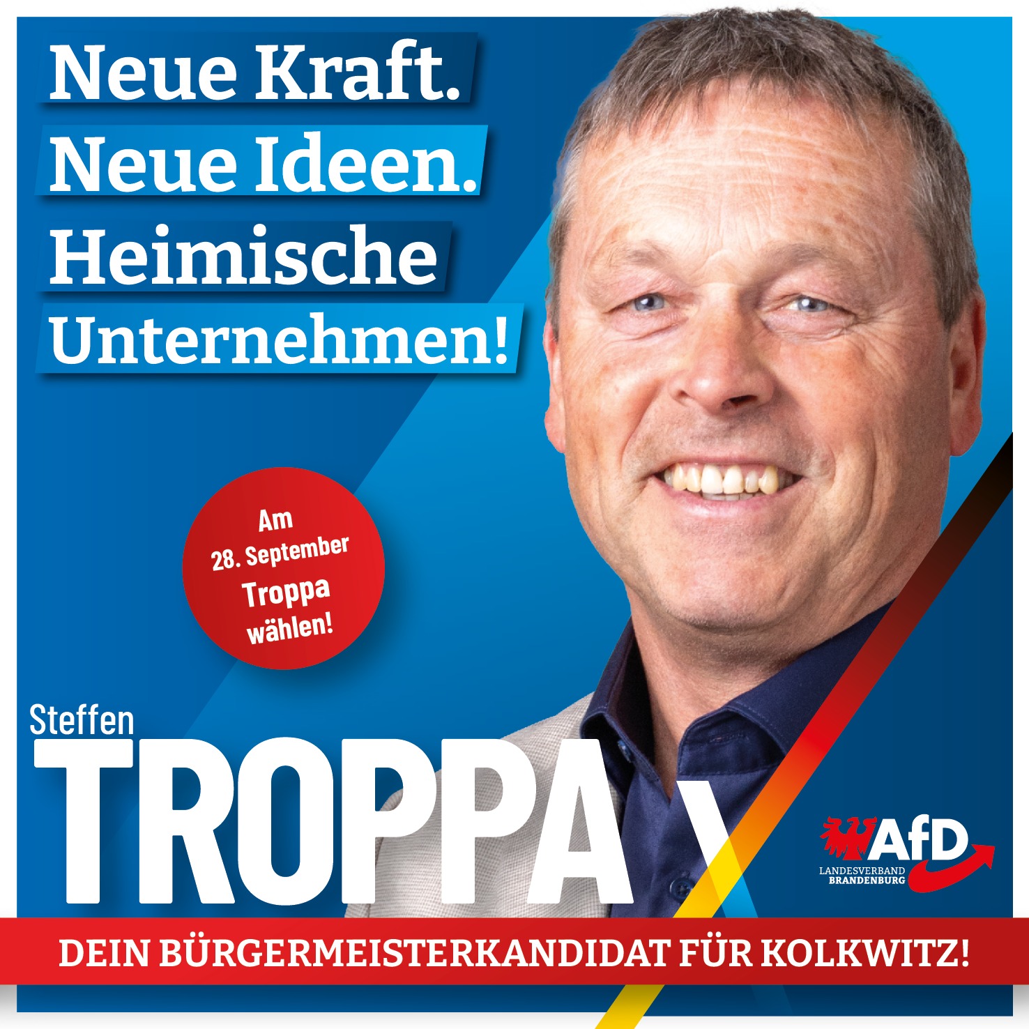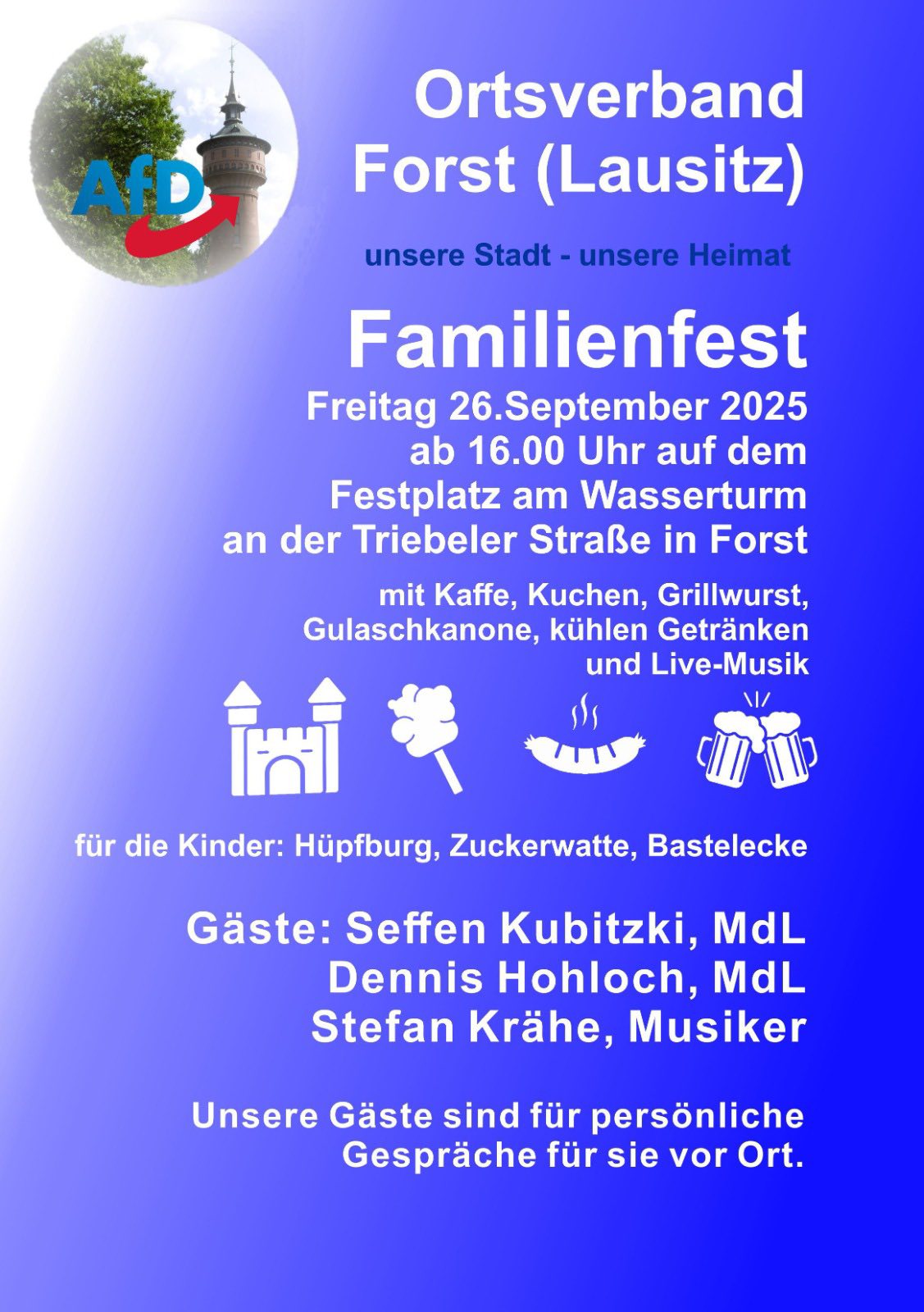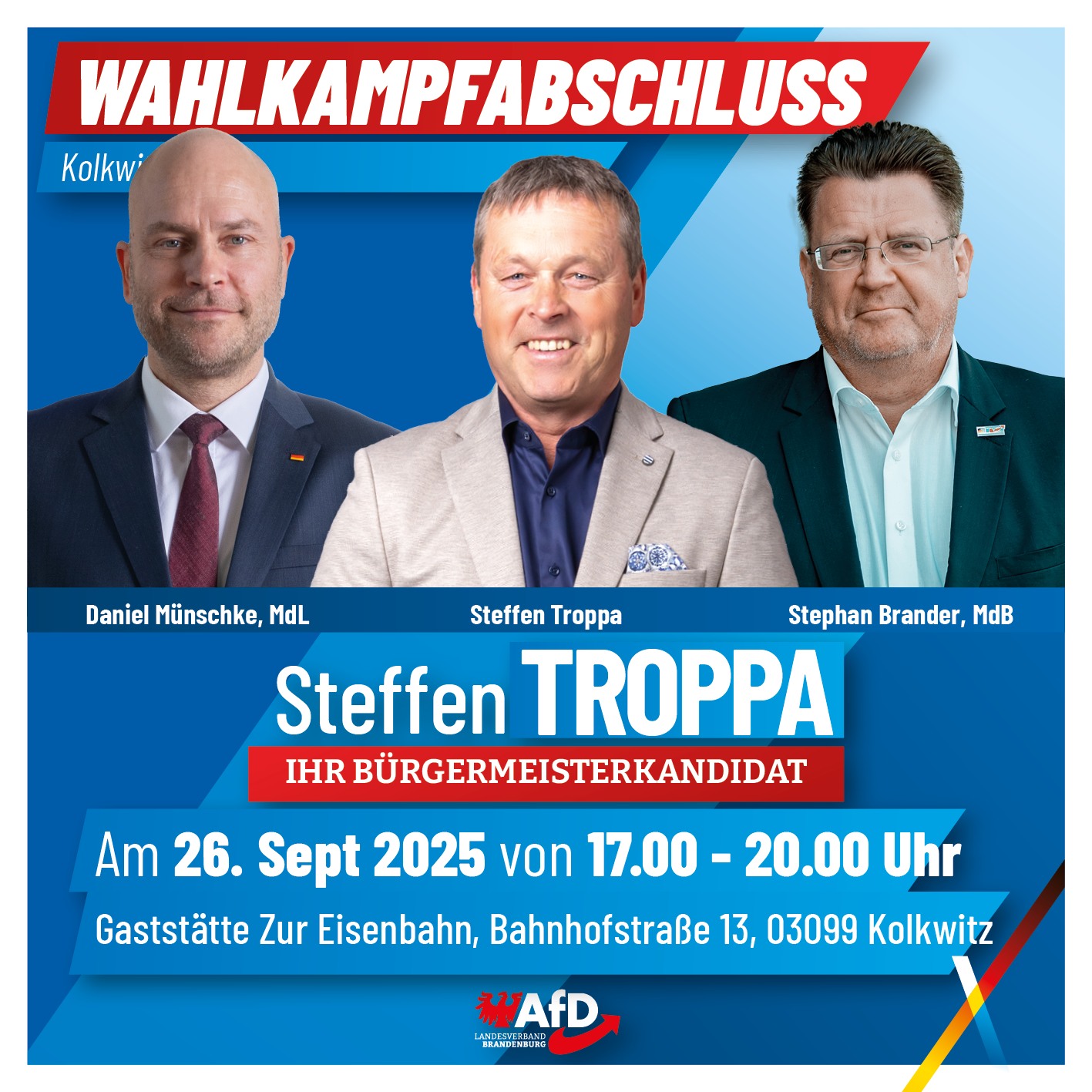 Zum Wahlkampfabschluss in Kolkwitz laden wir herzlich ein: Am 26. September erwartet Sie ein starker politischer Abend mit unserem Bürgermeisterkandidaten Steffen Troppa, dem Landtagsabgeordneten Daniel Münschke und dem Bundestagsabgeordneten Stephan